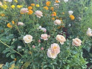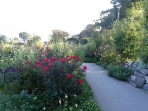 午後は今年春にリニューアルオープンしたあやせローズガーデンへ。綾瀬市が無料で開放しており、デザイン、監修を行う河合伸志先生の案内で11のガーデンを巡りました。美しい秋バラに迎えられ、秋の一年草、宿根草とのコンビネーションが見事でそれぞれのテーマガーデンごとに世界観を感じられました。面白い植物も多くあり、花壇にバジルやコリウス、パイナップルミントなど葉色がきれいなもの、斑入りのクズまで植栽されていました。先生がたのお話の中には、いろいろな品種や植物を買って業界全体を支えて盛り上げていきたいという話も心に残りました。