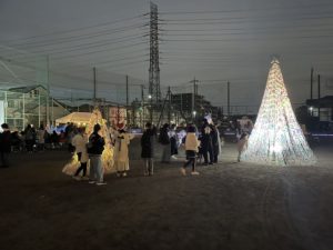 日が暮れるとペットボトルのツリーに灯が灯り、クリスマスのムードが高まります。