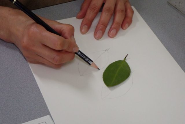 まず、下描きをします。実物大で描くので、サイズを測りながら、難しい場合は、紙の上に葉を置いて書き写す方法もあります。