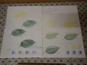 今回は、色鉛筆を使い、ツバキの葉を描きました。